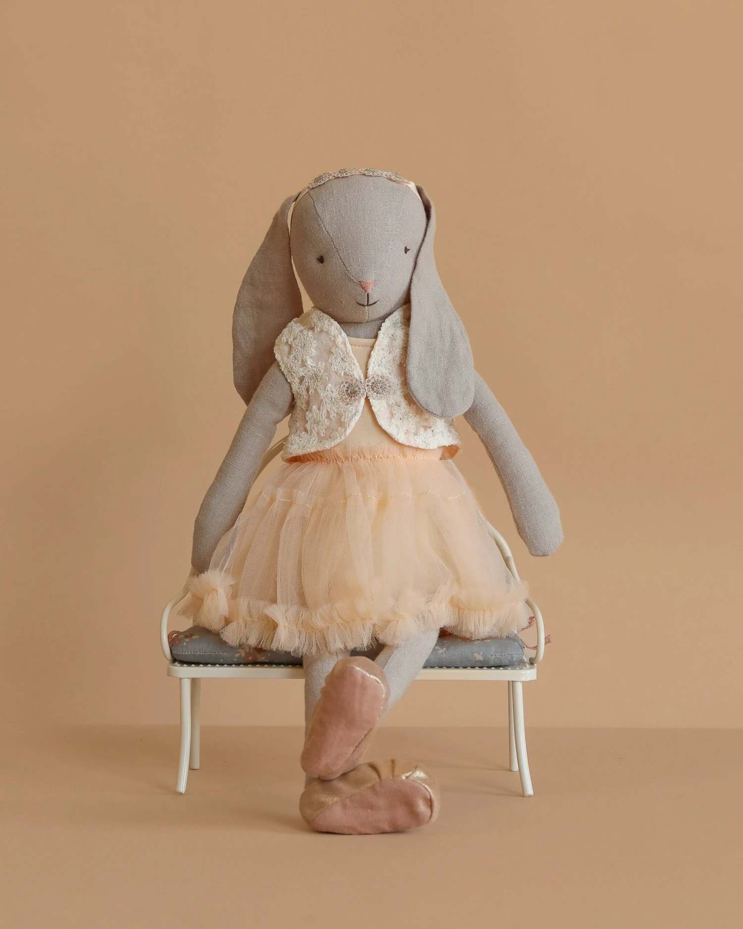 The well known Maileg bunny dressed up as a ballet dancer. It wears a cream colored suit, tulle skirt and ballet shoes.