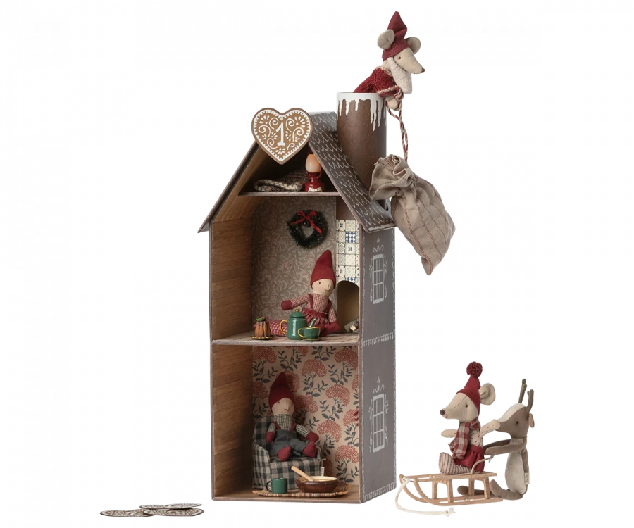 The Maileg Gingerbread House is designed for holiday surprises! Add your Advent gifts in the house and let your child decorate the rooms every Sunday when a new gift is opened. This house is the perfect size for micro Maileg friends and furniture. Gift tags no. 1-4 and logs for fireplace is included.Â