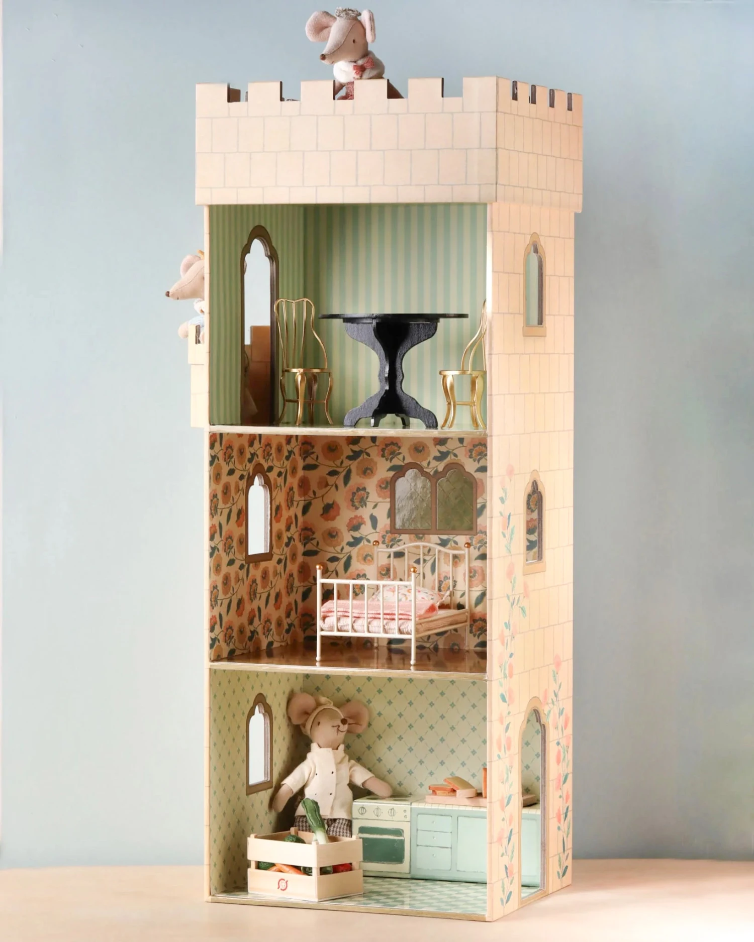 A beautiful castle for mice! It is made of sturdy cardboard covered in unique Maileg prints. Our amazing castle is designed specifically for big brother and sister mice, but smaller mice fit too. Adventures await, let the story begin!