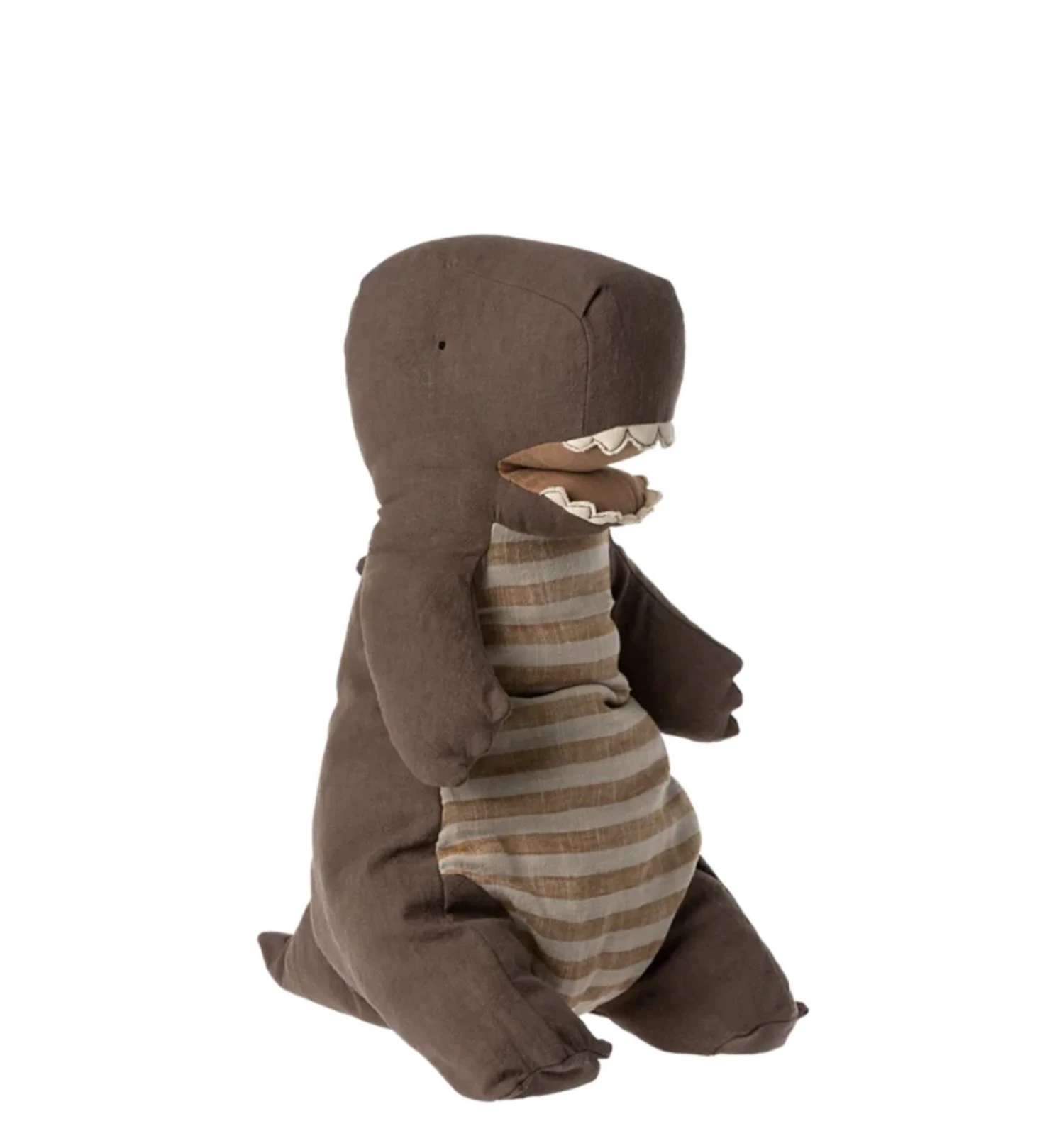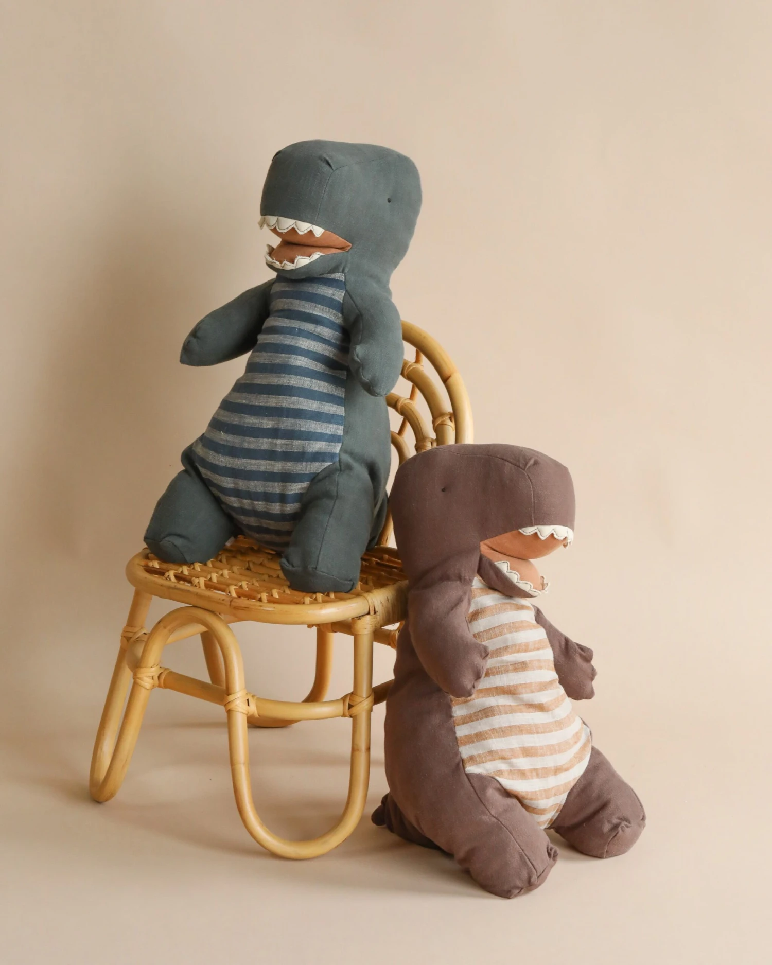 Look at this funny friend! A large Gantosaurus with big teeth has arrived and is ready to play with all of us. It is made in a soft mix of ramie and cotton, the striped stomach is made in a very nice blend of linen and cotton.