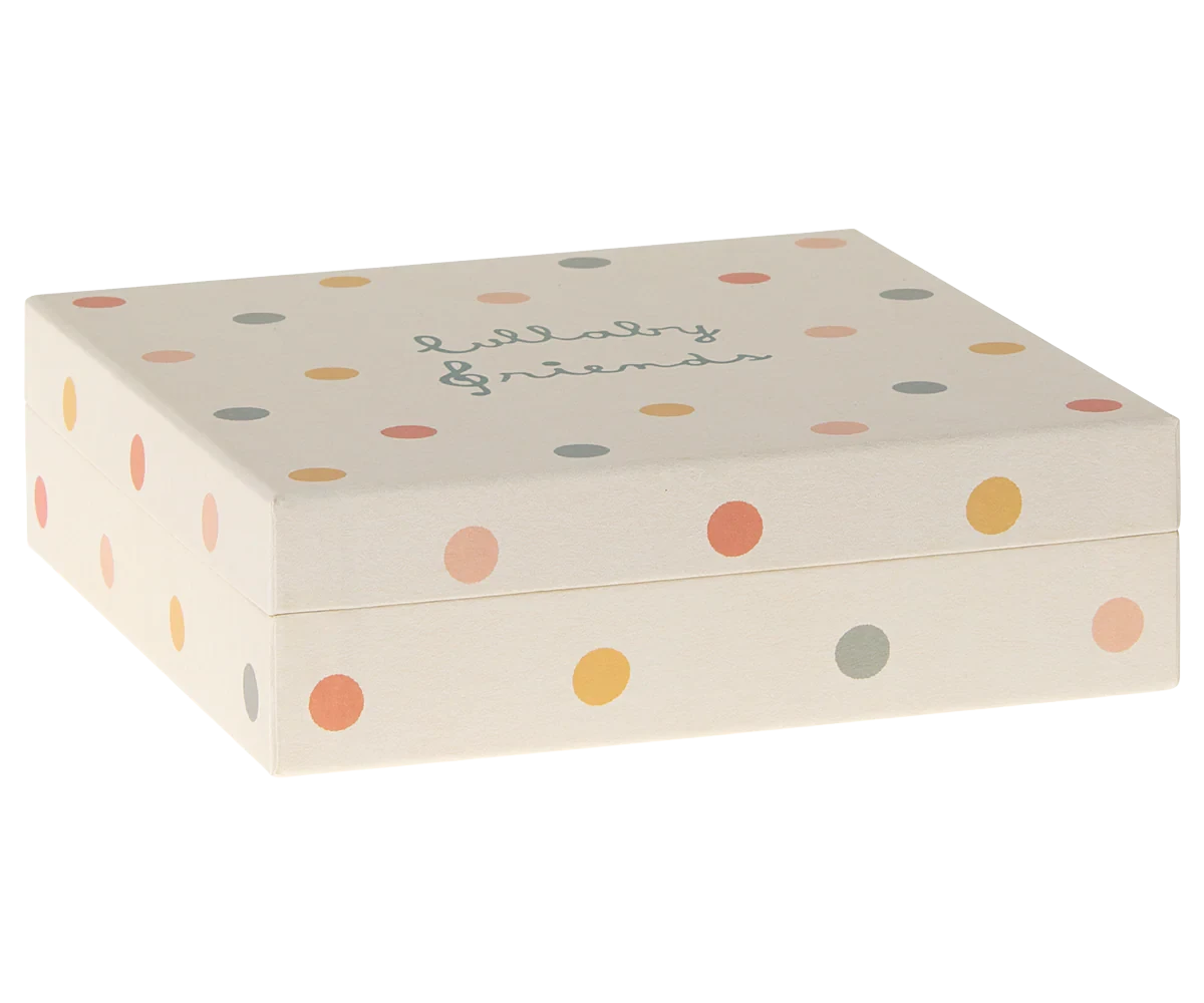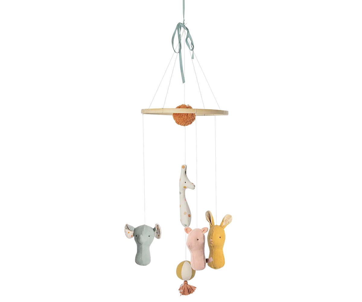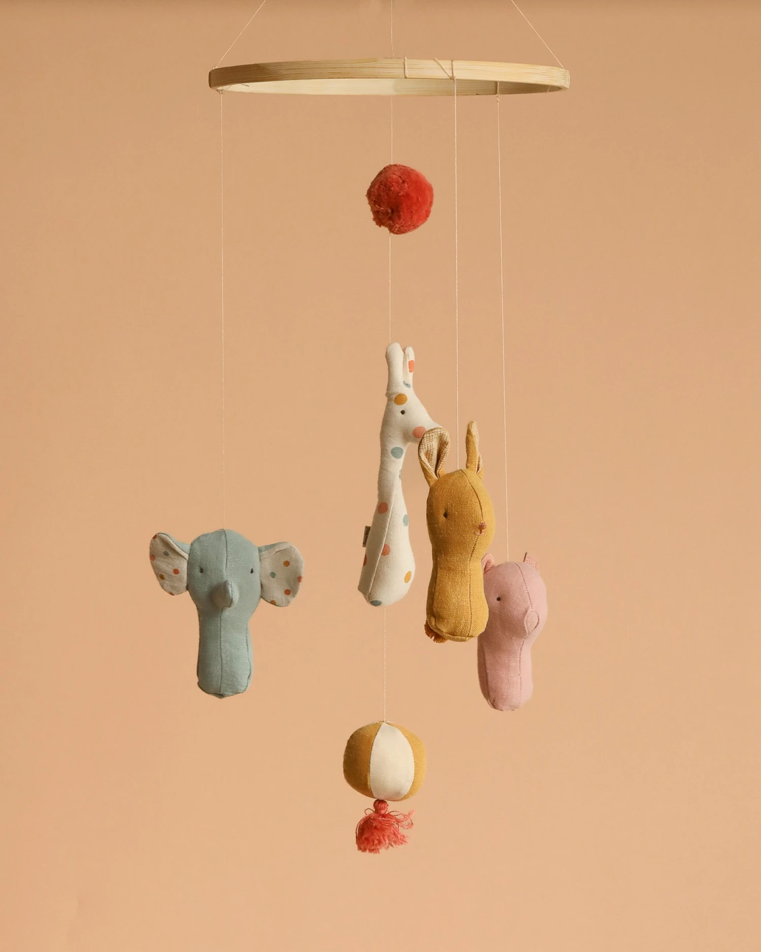 Lullaby friends is a collection of beautiful baby items. This mobile is perfect for the baby to look at from the bed or the nursery table. The animals are made in soft fabrics with unique prints and come in a beautiful gift box.