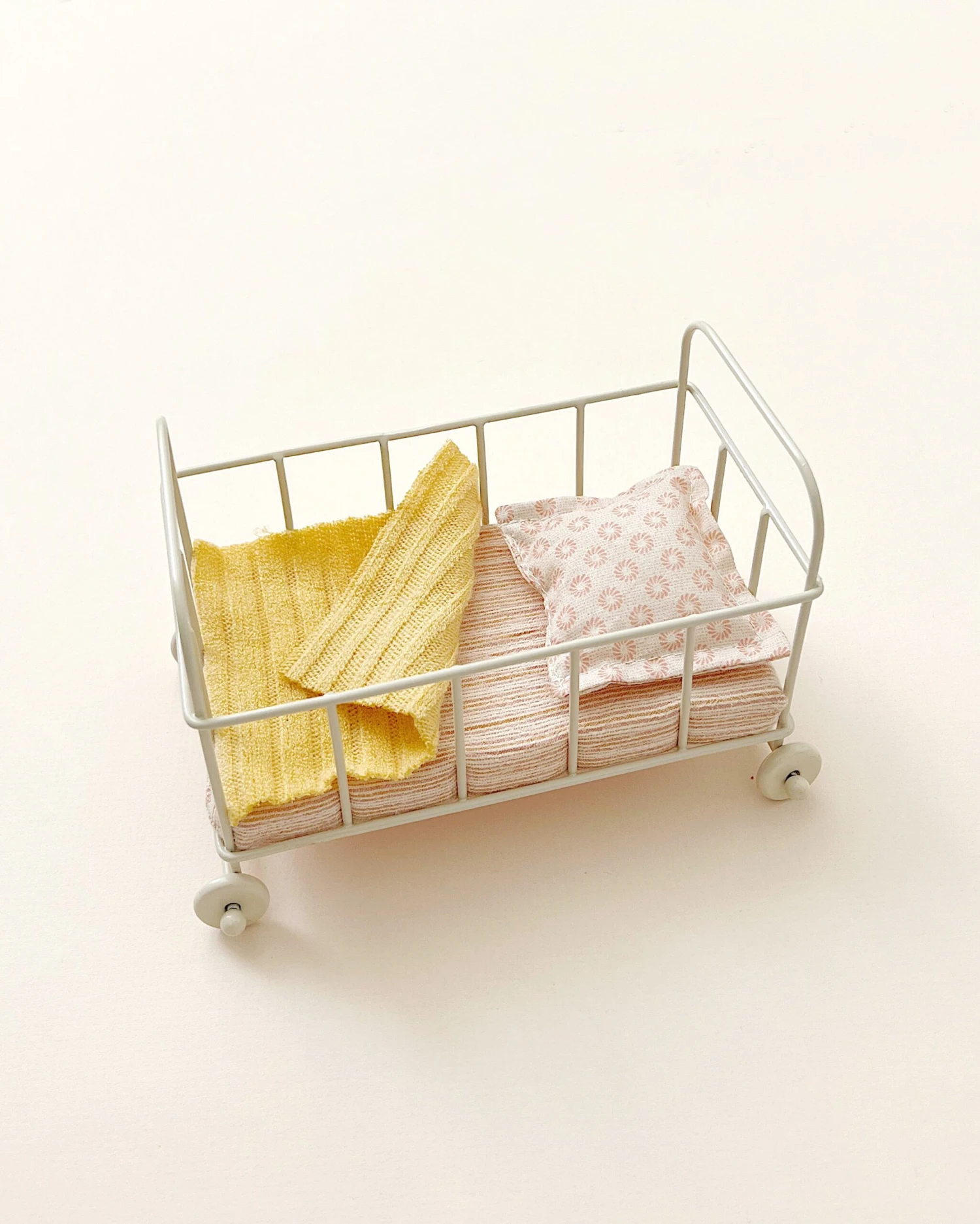 A cozy cot bed made of metal. It comes with a mattress, blanket, and pillow. You can tuck in your micro sized friends as well as the small mice.