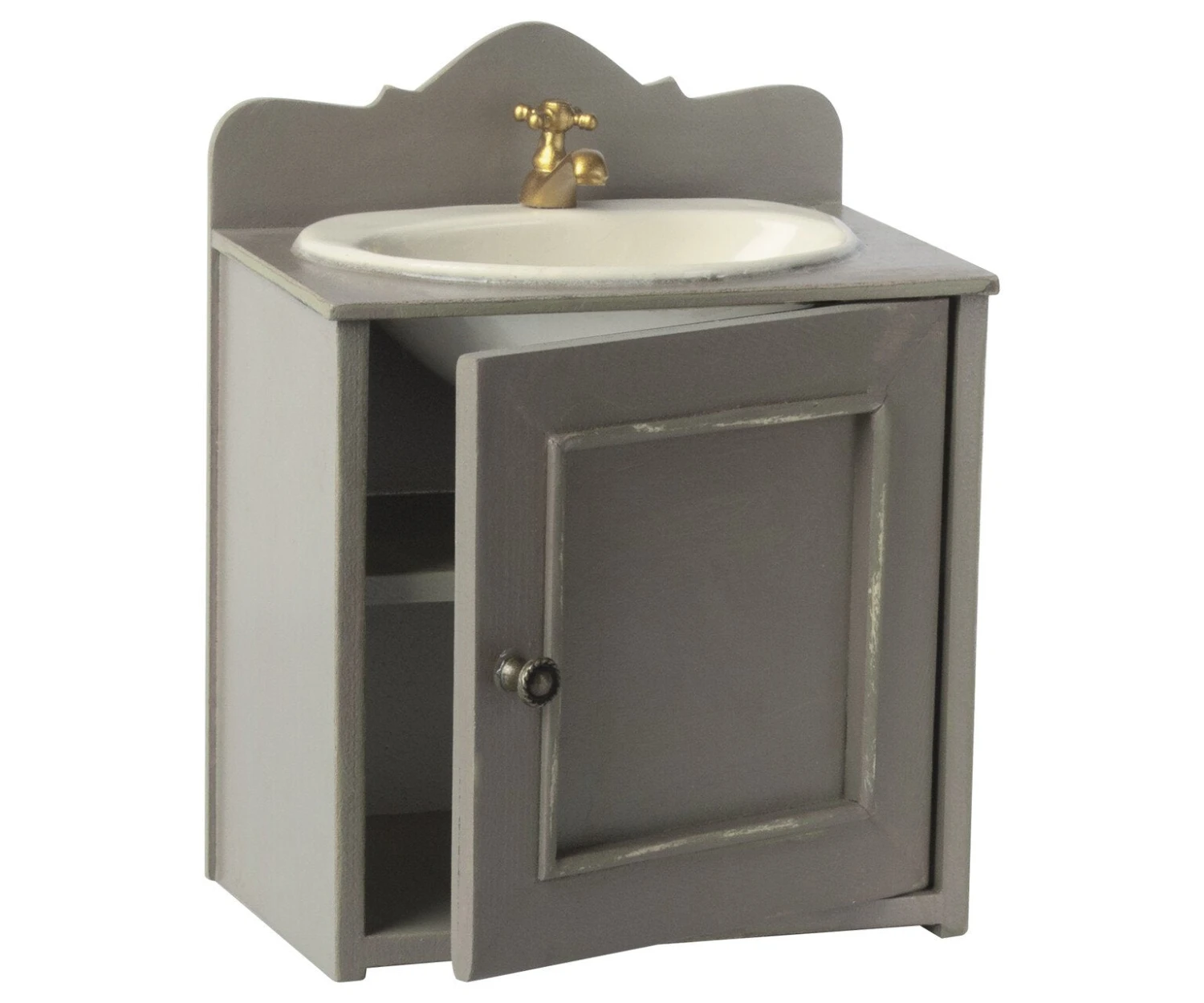 A beautiful vintage metal sink with a golden water tap. The sink with wooden storage shelves, where you can store your personal belongings.