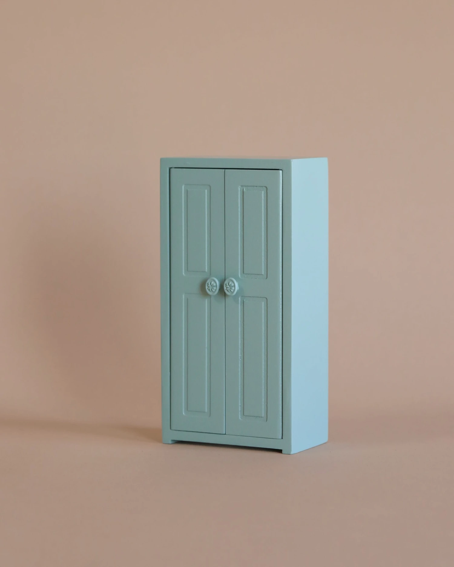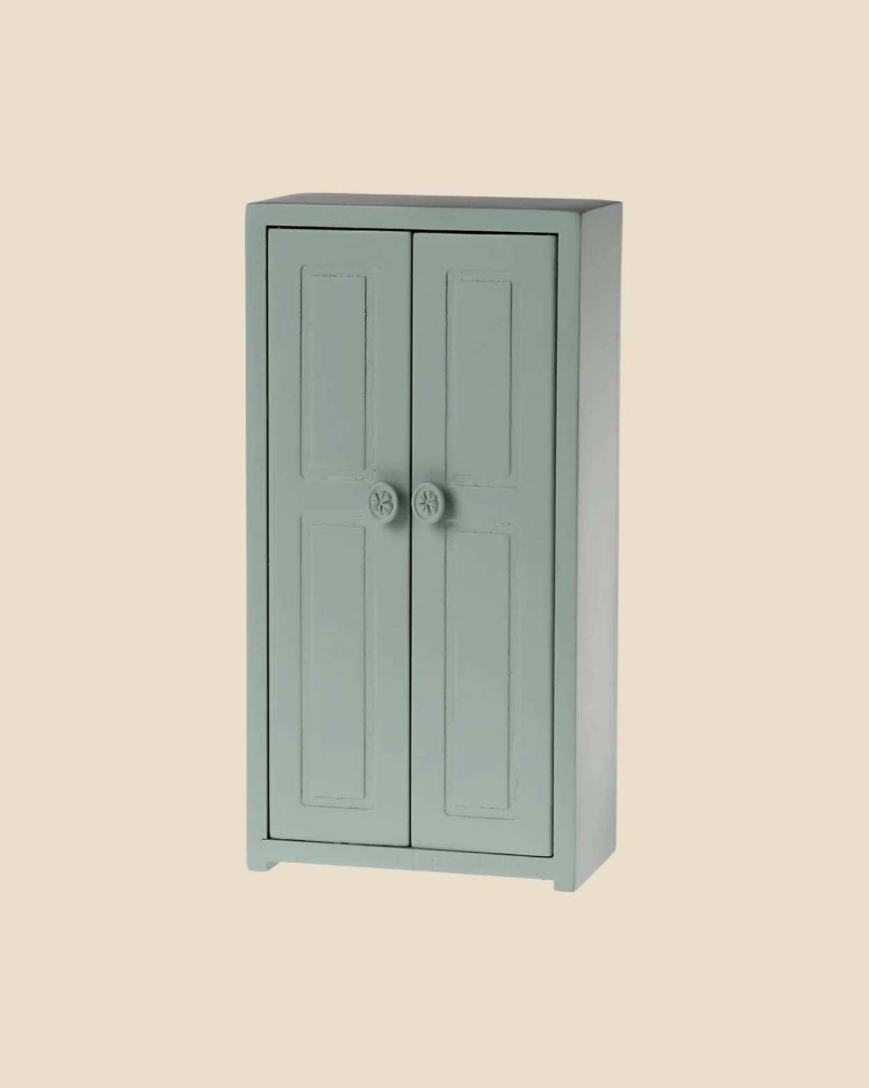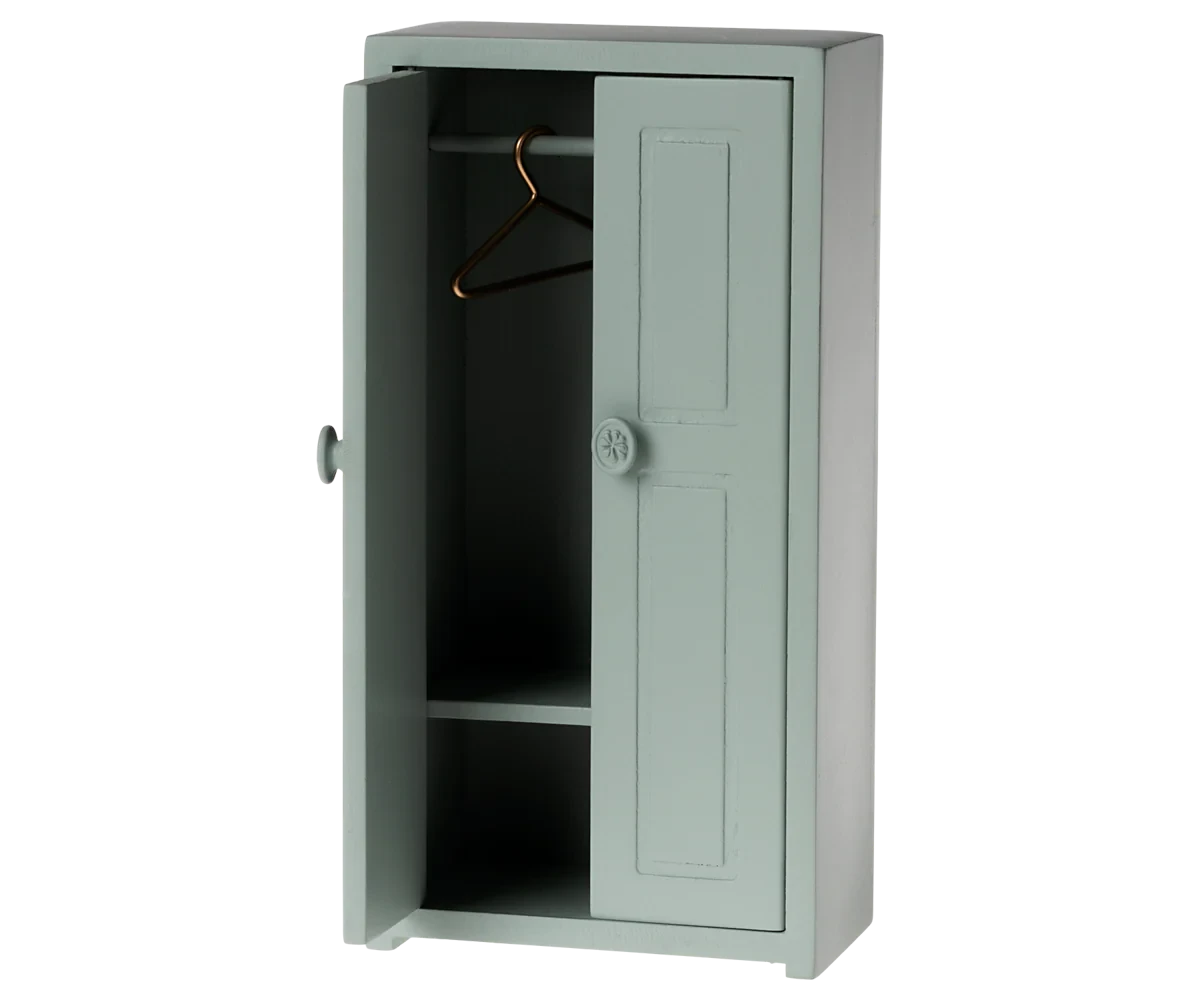 A small closet helps the mice family organize their wardrobe. The closet comes with three golden hangers.