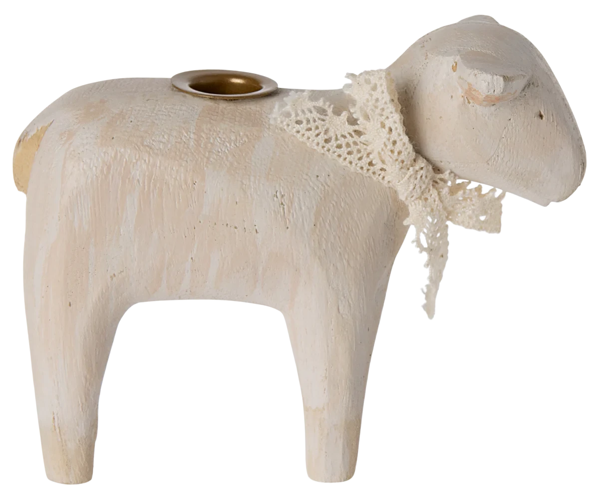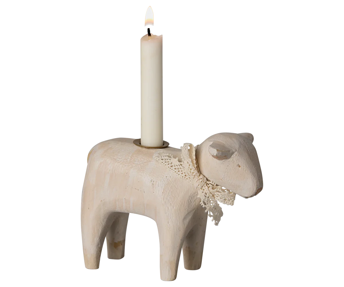 Let this beautiful candleholder decorate your home or on the Easter table. It is handmade which makes each lamb unique and has a soft ribbon around the neck. Never leave candles burning unattended!